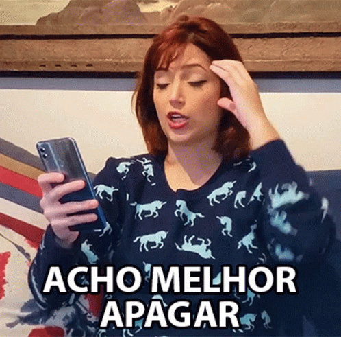 A woman on a couch looking at her phone, with the caption "Acho Melhor Apagar" (I think it's better to delete).