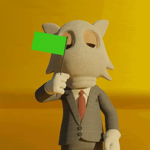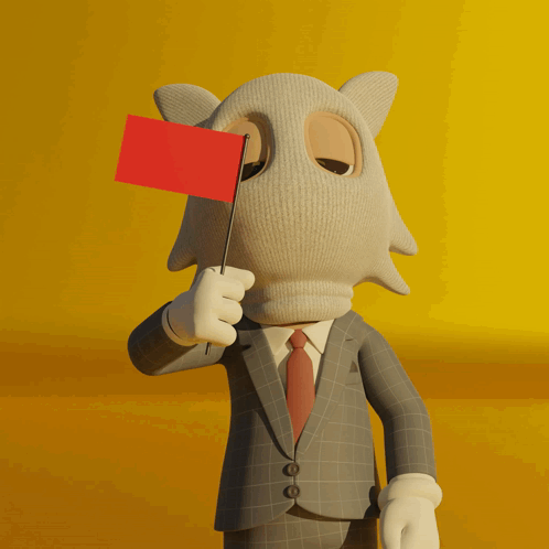 Akcb Wolfie, a cartoon character, waves a red flag while wearing a suit and tie.