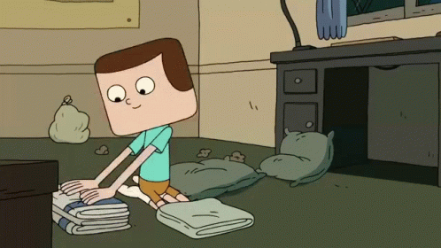 Clarence diligently folding a stack of clean laundry on the floor, tidying up his room.