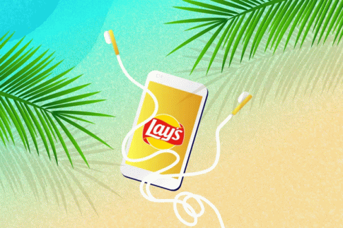 A smartphone featuring the Lay's logo, with earbuds, set against a vibrant summer beach backdrop with palm trees.