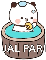 Cute cartoon panda relaxing in a blue hot tub, holding a snack, with 'Jal Pari' text.