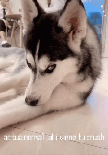 A husky dog reacts to seeing its crush, trying to act normal, with the caption 'actúa normal... ahí viene tu crush'.