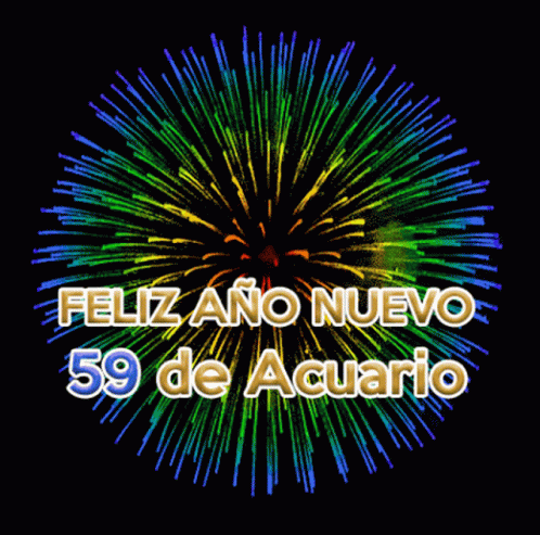 A vibrant fireworks display celebrates 'Feliz Año Nuevo 59 de Acuario' (Happy New Year 59 of Aquarius).