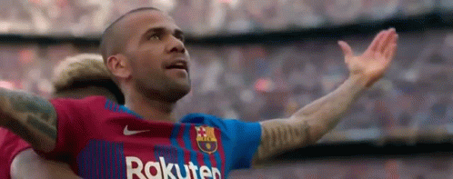 Dani Alves, wearing a FC Barcelona Rakuten jersey, celebrates a goal with arms outstretched on the field.