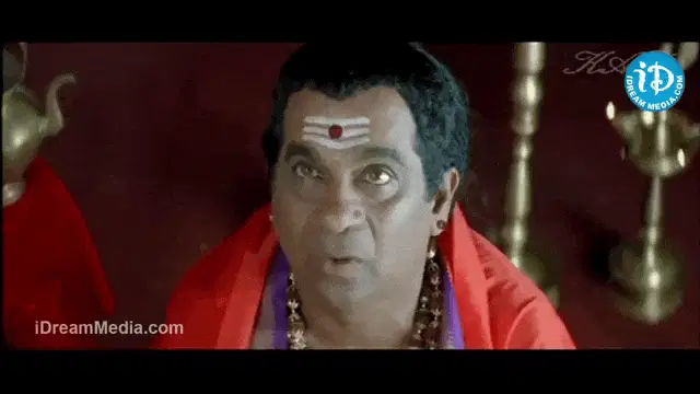 Brahmanandam and Jr NTR in a scene from the movie Adhurs, both dressed in traditional white attire, engaged in a lively discussion.