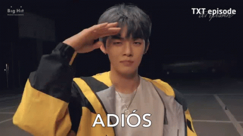 TXT member Yeonjun waves goodbye and says 'Adios' in a yellow and black jacket.