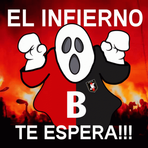 Cartoon ghost figure representing ADLG, with 'El Infierno B Te Espera' message, set against a fiery background.