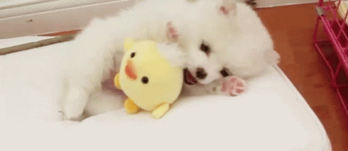 An adorable fluffy white dog gently cuddling and playing with a soft yellow duck toy.