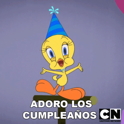 Tweety Bird, wearing a party hat, joyfully exclaims "I love birthdays!" in this Cartoon Network clip.