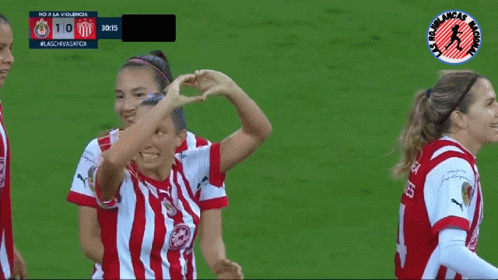 Adriana Iturbide, known as 'Boyi', celebrates a goal for Chivas Femenil, making a heart gesture.