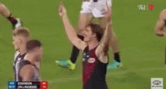 AFL player Joe Daniher in a footy match, interacting with opponents on the field.