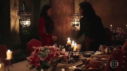 Afonso and Catarina share a romantic, candlelit dinner in a dimly lit room, from the series Deus Salve o Rei.