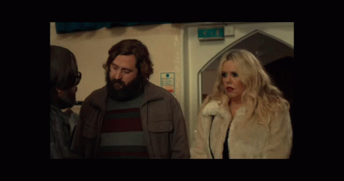 A funny moment from After Life where a man points and a woman reacts with surprise.