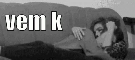 A woman lies on a couch in black and white, appearing distressed, with the Portuguese text 'vem k' (come here) appearing.