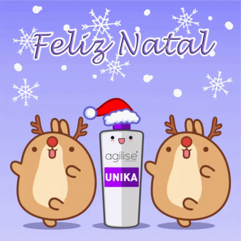 Agilise Cosmeticos Christmas advertisement featuring two animated reindeer and a product bottle.