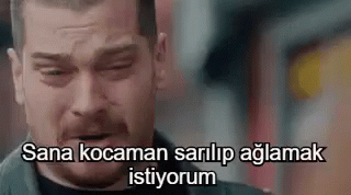 A man cries with the Turkish caption 'Sana kocaman sarılıp ağlamak istiyorum' (I want to hug you tightly and cry).