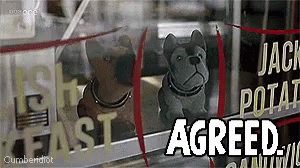 Two dog figurines in a window display with a sign that says 'AGREED.' and 'JACK POTATO'.