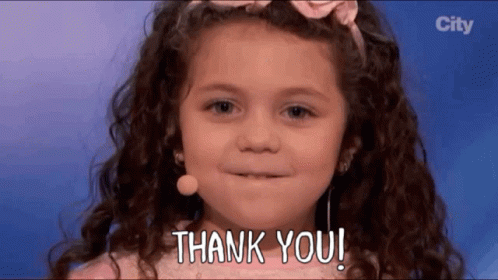 A cute little girl with curly hair smiles and says 'Thank You!' on America's Got Talent.