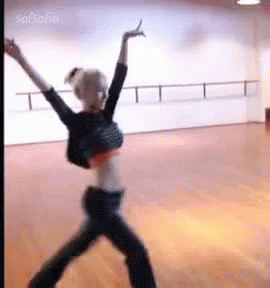 A woman in a crop top performs a flexible high kick in a dance studio, showcasing her agility and dance skills.