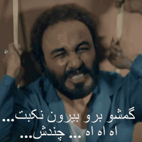 A man with a beard reacts with disgust, telling someone to get out, referencing the Iranian movie Hazarpa and actor Zhooleh.