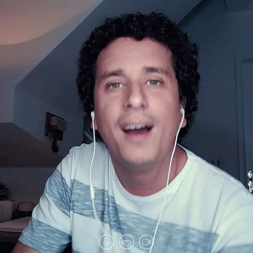 Rafael Portugal laughing and smiling, wearing headphones and a striped shirt during a video call.