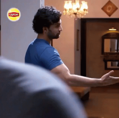 Pakistani actor Ahad Raza Mir, known from Hum Tum, looks around in a blue shirt.