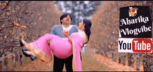 Pawan Kalyan carries Meera Jasmine in a playful scene, surrounded by apples in an orchard.