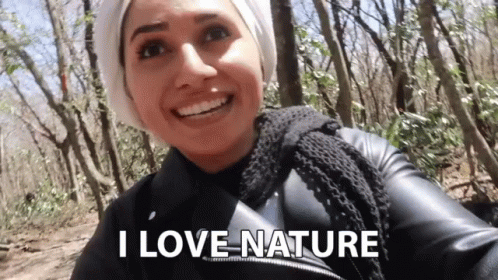 Zainab Al Eqabi smiles while taking a selfie in the woods, expressing her love for nature.