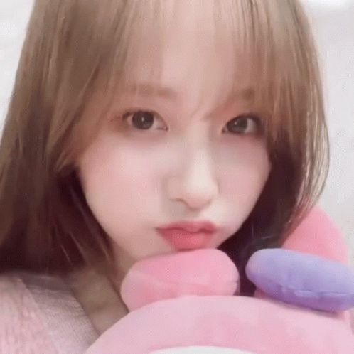 A young girl with light brown hair holds a pink and purple stuffed animal, looking directly at the camera.