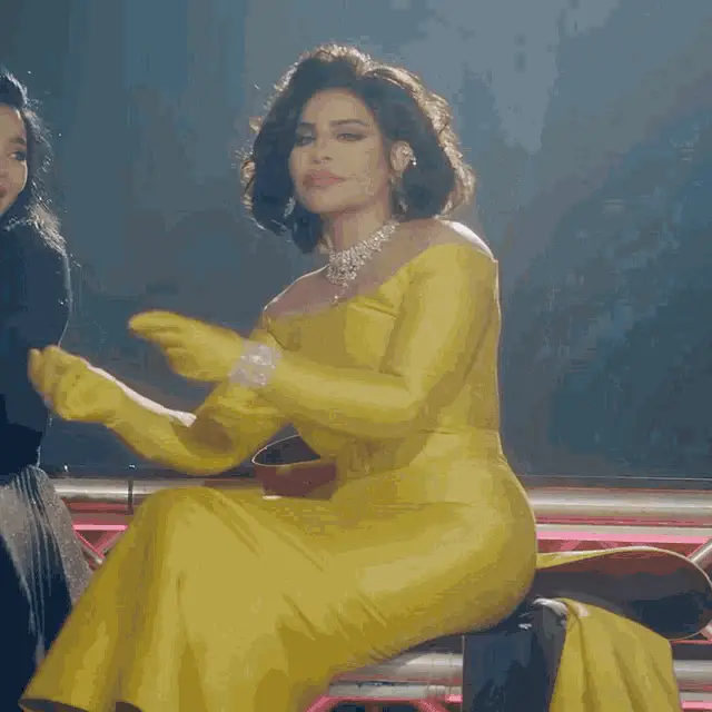 Ahlam Alshamsi gracefully dances in a vibrant, patterned dress as red rose petals fall around her in an urban setting.