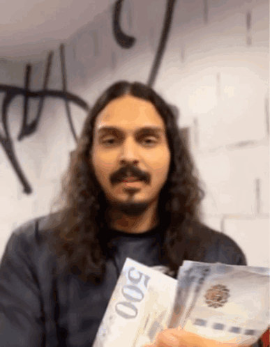 احمد شو وتيم باور يعرضان النقود، رجل ذو شعر طويل ولحية يبتسم.