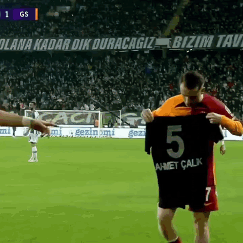 Galatasaray players pay tribute to Ahmet Çalık by holding up his number 5 jersey on the field during a match.