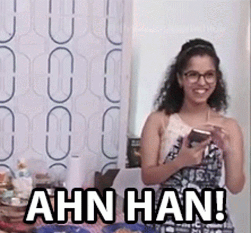Catherynne E Guilherme smiling and saying 'Ahn Han!' while holding a phone.
