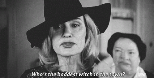 Glen Close as a powerful witch in American Horror Story, asking 'Who's the baddest witch in town?'