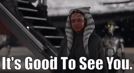 Ahsoka Tano, portrayed by Rosario Dawson, greets someone with 'It's Good To See You.'
