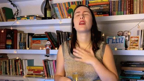 Woman expresses a moment of profound relief, holding a champagne glass in front of a bookshelf with a 'Feliz 2020' sign.