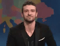Justin Timberlake makes a funny face while saying 'ai, paraá' (oh, stop it) in a humorous reaction clip.