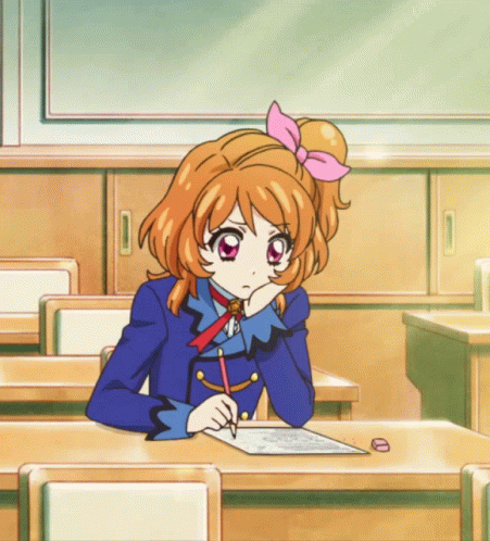 Akari Ozora from Aikatsu looks bored and frustrated in class, struggling with her studies.