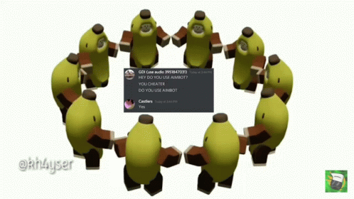 Castlers Roblox avatars dance in a circle as a Discord chat reveals an aimbot confession.
