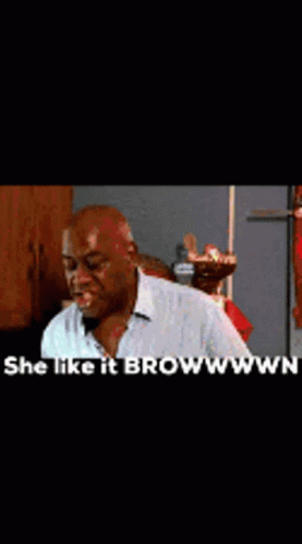 Ainsley Harriott in the kitchen with a woman, humorously stating 'She like it BROWWWWN' while cooking.