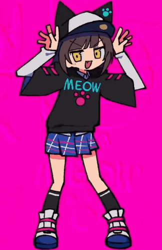 Animated Neko girl from Aiobahn dances energetically, wearing a 'MEOW' sweater and cat ears.