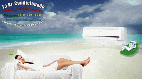 A woman relaxes on a couch on a serene beach, enjoying the cool breeze from an air conditioner.