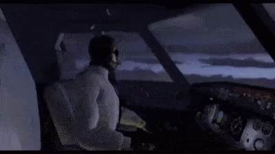 A person in a white shirt pilots an aircraft in a flight simulator, with radar visible and a cloudy sky.