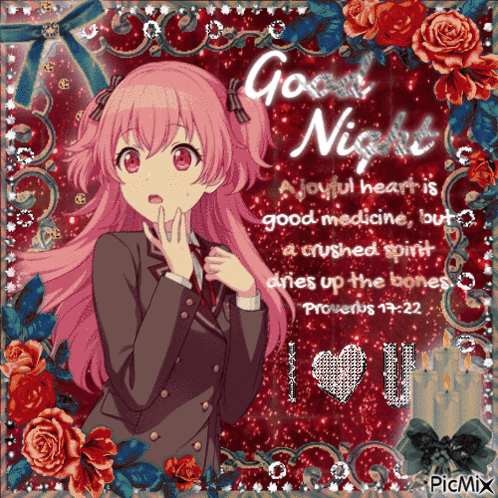Airi Momoi from Project Sekai with a 'Good Night' message, Bible verse Proverbs 17:22, and 'I Love You' text.