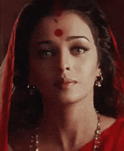 A close-up of Aishwarya Rai Bachchan from the movie Devdas, featuring her in traditional Indian attire with a bindi.