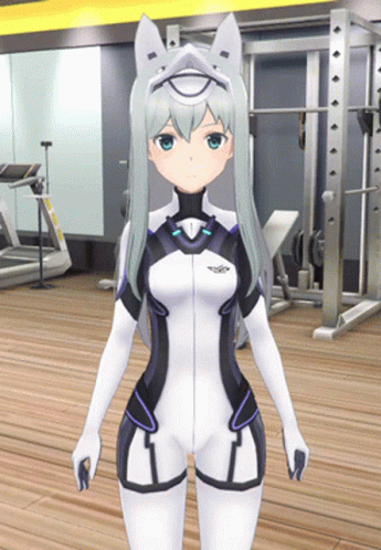 Ait Dariusburst character, a girl in a futuristic white suit, performs warm-up stretches in a gym setting.