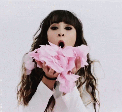 Aitana Ocaña playfully blows pink confetti towards the camera, creating a whimsical effect.