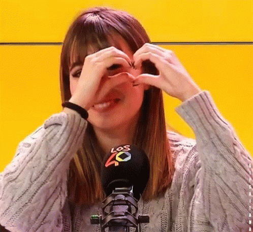 Aitana Ocaña smiles and makes a heart shape with her hands in front of a Los 40 microphone.