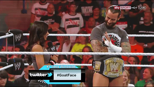 AJ Lee and CM Punk share a moment in the WWE ring, with a trending hashtag #GoatFace visible on screen.