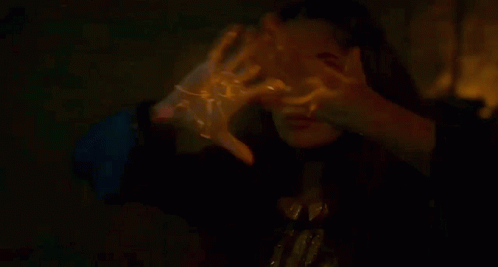 Ajak from Eternals, played by Salma Hayek, manifesting her cosmic powers with glowing hands.